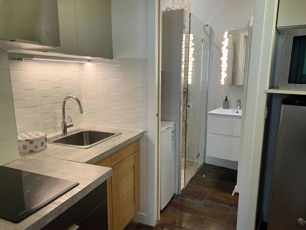 The fully equipped kitchen has a sink, toaster, electric tea kettle, mini refrigerator, microwave, stove and more. Full sets of dishes, cutlery and crockery are provided along with pots, pans and kitchen utensils. The flat comes with a clothes washing machine and drying rack. An iron and ironing board, vacuum, mop and broom are available.