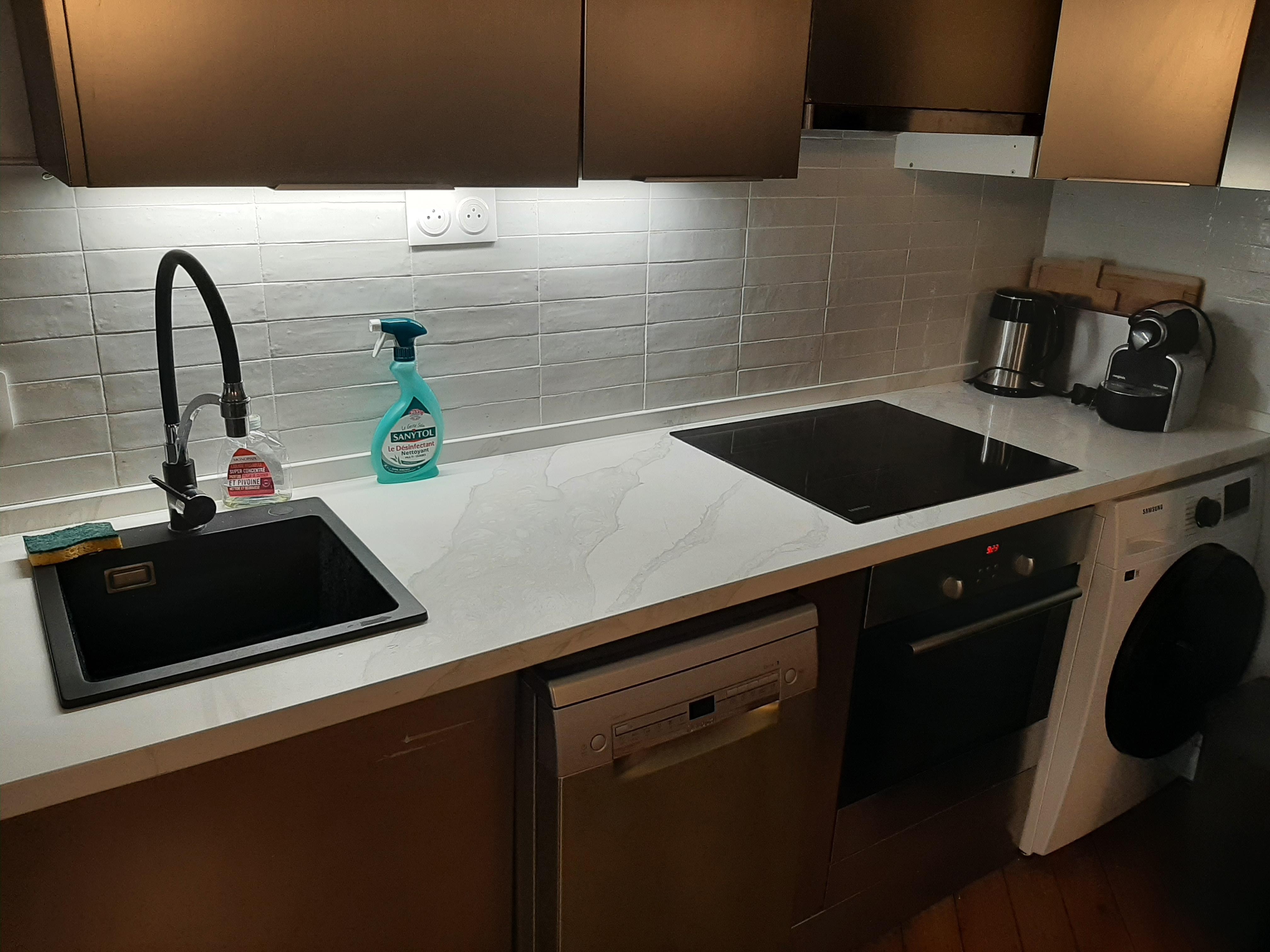 The fully equipped kitchen has a sink, toaster, electric tea kettle, refrigerator, stove, Nespresso coffee machine, dishwasher and more. Full sets of dishes, cutlery and crockery are provided along with pots, pans and kitchen utensils. The apartment has a combination clothes washer and dryer. An iron and ironing board, vacuum, mop and broom are available.
