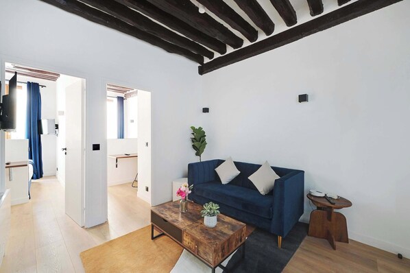 Comfortably accommodating up to 4 people, it's perfect for a Parisian getaway with family or friends. A true haven of peace and comfort, it features immaculate walls in brilliant white, amplifying natural light and creating a serene atmosphere. A subtle touch of navy blue adds a sophisticated, contemporary touch.