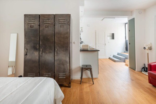 L'espace chambre respire la tranquillité et l'élégance minimaliste, centré autour d'un lit double moelleux orné de draps de qualité hôtelière qui promet des nuits reposantes. Un grand espace de rangement garantit que les effets personnels sont soigneusement rangés, conservant ainsi l'ambiance sereine de la pièce. Un fauteuil confortable invite à des moments de réflexion tranquilles, placé à côté d'une table de chevet élégante qui contient une lampe de lecture ou une tasse de café du matin.
