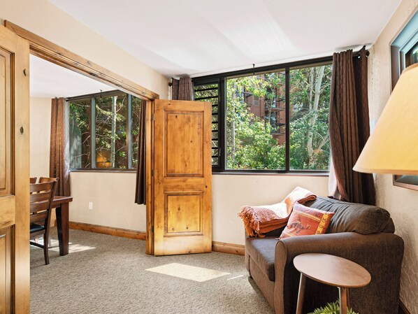 Step into a spacious and inviting living room as you enter this stylish condo. Adorned with plush seating, a flat-screen TV, and a wood-burning fireplace, the living area serves as the perfect hub for unwinding after a day of mountain adventures—it even has a sleeper sofa. Seamlessly connected to other parts of the home, this space provides both comfort and convenience.