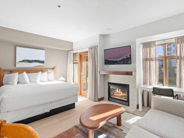 Discover a spacious living area adorned with large windows that showcase breathtaking views of the surrounding landscape. Unwind in front of the large flatscreen TV or cozy up by the warmth of the gas fireplace. Connected to this inviting space is a private bedroom featuring a king-size mattress and an additional TV, ensuring a restful night's sleep after a day on the slopes.