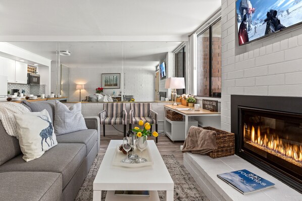 Living Room: Features comfy contemporary furniture, including a new queen sofa sleeper, 43” Samsung Smart TV with Roku and cable programming, cozy gas fireplace, and a desk at the window complete with golf course and mountain views. There is access to the patio where you will find a gas BBQ and enjoy more surrounding views.