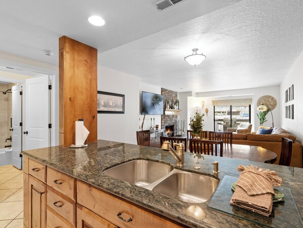Proceed further down the hall, and you'll discover the heart of this condo - the central living area, dining space, fully-equipped kitchen, and a guest bathroom.