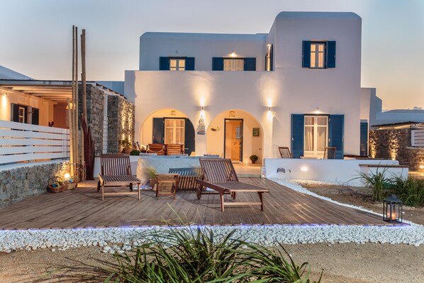 Uteplassen er like sjarmerende, og kan skilte med en stor hage, et privat svømmebasseng og boblebad, spiseplass og mange sittegrupper å velge mellom, alle med utsikt mot sjøen og øya Naxos.