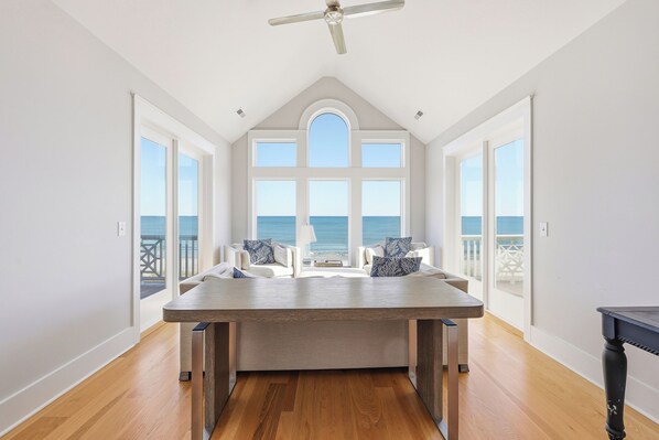 Sunburst boasts a blend of modern amenities and coastal charm. Featuring a well equipped kitchen adorned with sleek appliances and granite countertops, breakfast bar and large dining room table, a beverage refrigerator and two spacious living areas adorned with tasteful coastal décor. The first floor features two creek front bedrooms, each with one Queen bed and one Twin bed and a private bathroom in each. Up the stairs as you enter the second living area, you are greeted by panoramic views of the Pawleys Island Beach shoreline. Large flat screen TV and sufficient seating, guests can access two porches off of this living area to listen to the waves crash. The second floor features four bedrooms. The two creek front bedrooms each have one Queen bed and one Twin bed and a private bathroom in each. The South oceanfront bedroom includes one Queen with a private bathroom. The master suite features one King bed with a private bathroom featuring a soaker tub and shower.