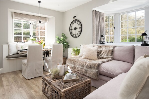 Sitting room with large corner sofa, dining space with seating for four, wall-mounted 43" Smart TV, wood burning stove.