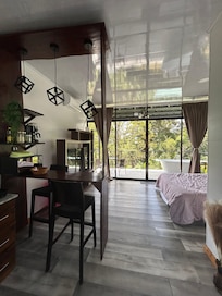 The views of the rainforest from the patio are spectacular and serene. Scarlett macaws and toucans can be seen in the front yard at dawn and dusk. The room is clean and comfortable. The kitchen offers everything needed to cook basic meals. The smart tv has Netflix and a cozy evening in can be spent cuddling on the bed. Emily and her parents are very kind and helpful.A second hook in the bathroom for towels and some hooks by the entrance for raincoats would be a great addition.Thank you for having us and your help! It’s the perfect location; a beautiful oasis in the rainforest but still close to town!