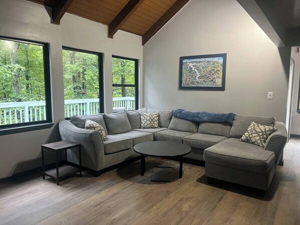 Living Room: A welcoming space with a 70” smart TV, electric fireplace, and a spacious sectional sofa that doubles as extra sleeping space. Enjoy family board games, books, and cozy nights in.