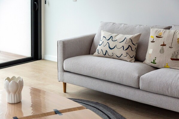 Outside, enjoy a south-facing landscaped garden. Sun loungers and garden furniture await you on the beautiful wooden terrace (no barbecue). A secure garage lets you store water sports equipment or bikes. There’s a shower for rinsing off after the beach.