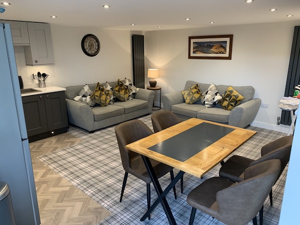 3 flat screen TVs including free sat and Netflix, Internet,google Home, Electric cooker, Microwave, Dishwasher, Fridge freezer, Bio ethernol fire, Central Heating, Hot tub, Private garden, BBQ, Parking, The Cross keys pub is 20 minutes walk alone the river lune or 5 minutes drive.