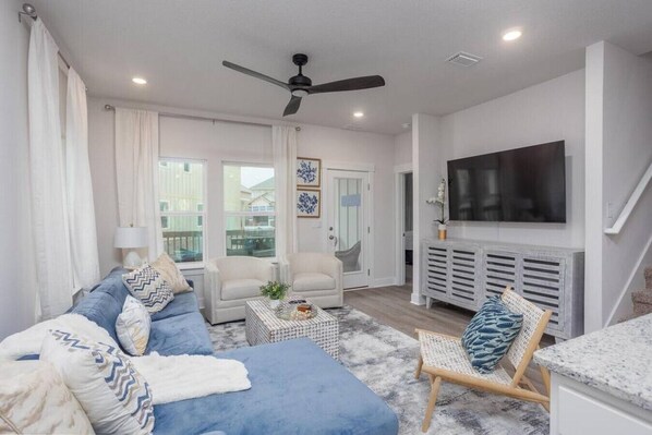 Serenity Sky is a perfect place for families and adults to enjoy beautiful modern style, designer touches at every turn and luxury details that stand out among the average vacation rental including: luxurious organic linens and bedding, plush oversized bath towels and beach towels, UHD Smart TVs in every bedroom with 65" TV's wall mounted in living room and 2nd den/game room. Plus! a well-equipped kitchen, comfortable outdoor living area with fire pit, all within just a mile from the beach!