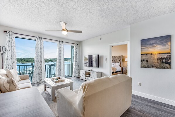 Enjoy kicking back in a condo flooded with natural light and decorated in a fun modern style! Watch the sunrise and the sunset over the bay– you'll have one of the best views of the inter-coastal waterway and its boat traffic, and you're free to enjoy them out on the furnished balcony. Inside, this brightly-lit condo features central AC, a ceiling fan, and modern decor. Relax inside in central air conditioning, with a bonus ceiling fan in each room set up so you're even more comfortable. A private washer/dryer will make sure all the swimsuits are ready for your next jaunt down to the beach. Guests can also enjoy access to a shared hot tub and outdoor pool during their stay!