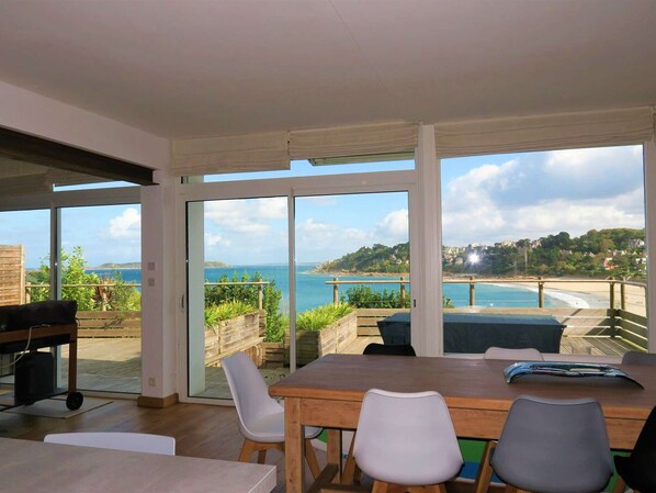 1 large living room clear and spacious EXCEPTIONAL SEA VIEW with a sitting area with TV, sofas, armchairs, decorative stove, and a dining area, overlooking a large wooden terrace