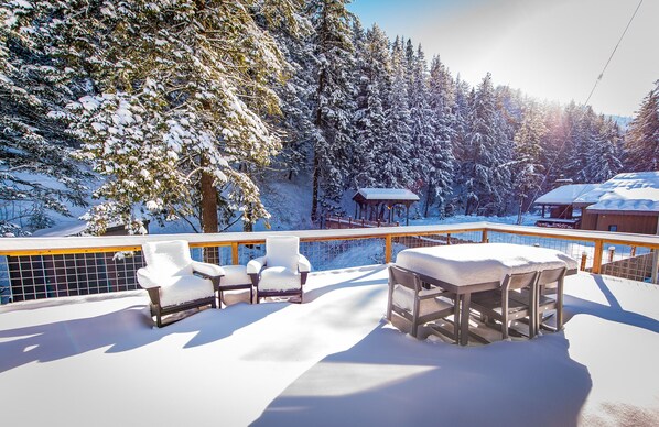 Venture outdoors to the expansive deck, where el fresco dining and leisurely lounging await. Sip your morning coffee as you bask in the tranquil beauty of nature under the starlit sky for an unforgettable evening.