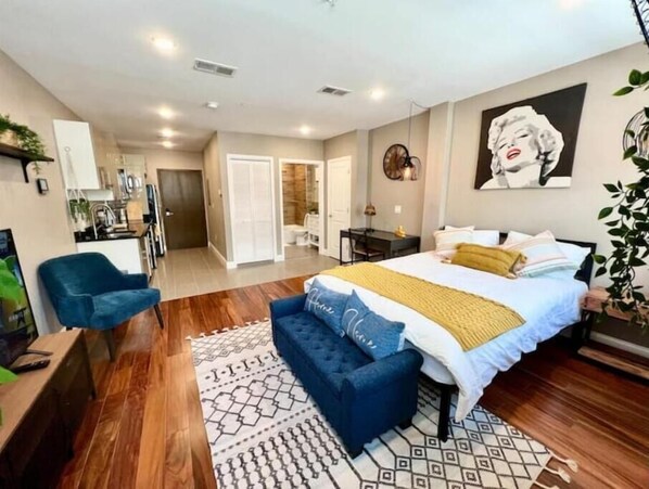 Cons: Of course the owner threatening to cancel if I didnt pay more money which made me feel not comfortable there and felt as if I made one wrong move I would get cancelled or locked out, the bathroom is a flip with half shower door which in turn soaks the entire bathroom making it a water closet, the tub was very flimsy. It is downtown and the street noise is very loud (Expected but just for others to be aware). Every time I tried to cook the smoke detectors would go off (even heating food in the microwave).