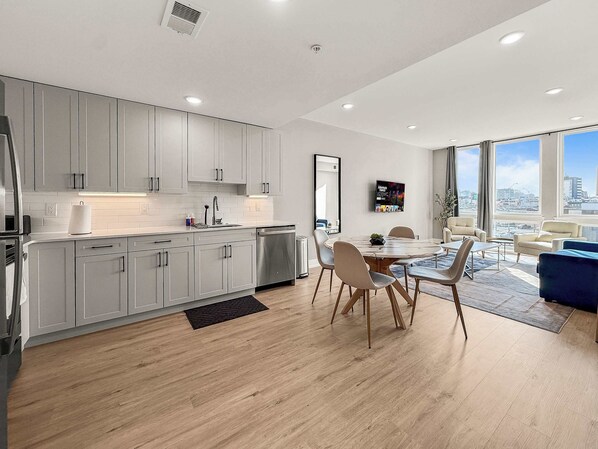 The fully equipped kitchen features modern appliances and everything you need to whip up a delicious meal. Enjoy your culinary creations at the dining table.