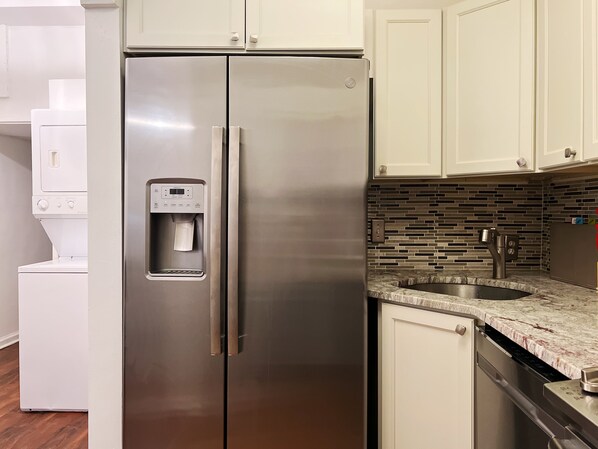 Enjoy intimate meals in the small dining space, perfect for catching up with friends or family over delicious fare. After a day of exploring, toss your laundry in the convenient washer and dryer, ready for fresh adventures the next day. And, of course, high-speed WiFi keeps you connected throughout your stay.
