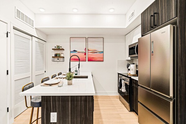 Your comfort is our priority, so we have provided the following for your convenience: ✔ Body wash, shampoo, and conditioner per bathroom ✔ Toiletries (toilet paper, toothbrush, toothpaste) per bathroom ✔ Kitchen & Cooking essentials included (coffee, sugar, oils, pots and pans, dinnerware, glassware, cutlery, paper towel and more) ✔ Trash bags for the kitchen and bathroom ✔ Dishwasher pod ✔ Laundry pods (there is an in-unit Washer and Dryer)