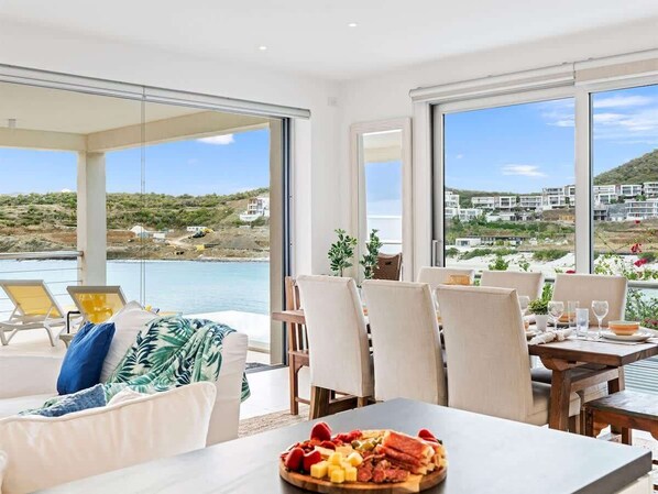 *Vaulted ceilings and telescoping sliding glass doors open the back of the house and bathe the villa’s central living space in fresh caribbean air & natural light. Lounge on the comfy pottery barn sofas, binge your favorite series on the 65" Samsung Smart TV or just stare into the with unobstructed views of endless ocean that blend seamlessly with the house. Whether you're gathering with friends, family or unwinding solo, this is a house that will make you feel right at home.