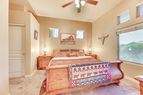 Gjesterom med airconditioning på 3 Mi to Usery Mtn Regional Park: Poolside Paradise har strykejern/-brett og takvifte. Rommene har terrasse. Gjesterommene ved denne cottagen med 3 stjerner har kjøkken med komfyrtopp, mikrobølgeovn og oppvaskmaskin. Badene har badekar eller dusj.