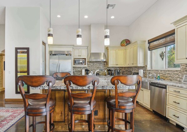 My tennis team stayed at the Villa while competing in a tennis tournament. Everyone was comfortable. There is so much space that early birds could be up and chatting and not disturb sleeping people. It was key to have a tennis court on the property so we could get a warmup before our tournament. We had a big team dinner one night and the kitchen is truly equipped for any large meal you might want to make. The kitchen has sharp knives, many pots and pans, plenty of silverware, Basic spices, a Keurig machine and some pods and a coffee machine. The two dishwashers in the kitchen made clean up easy! We felt secure with the gated driveway. Easy checkin and out. We will definitely book again.