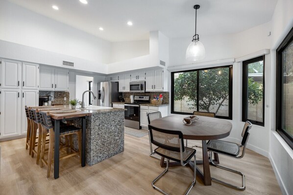 Inside, you'll find open and bright interior spaces, neutral color palette with contemporary amenities. Prepare everyone's favorite recipes in the well-equipped kitchen with stainless steel appliances, and then enjoy more formal meals or family game nights in the adjacent dining area with a table for four. Relax in the living area and stream your favorite channels, or step outside and soak up some Arizona sunshine on your furnished patio overlooking your own private pool heated for year-round enjoyment!