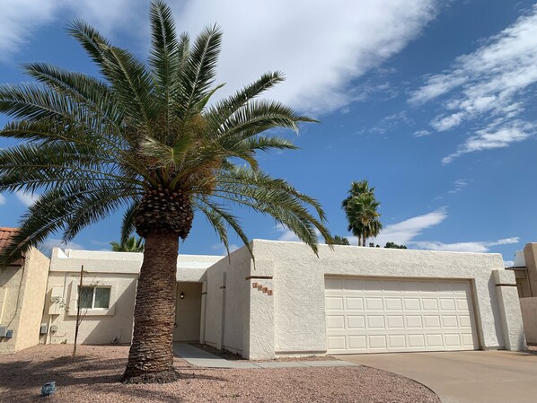 Come experience this cozy getaway located right on the Painted Mountain Golf Course. With a separated half of the house, enjoy your own bedroom, living room, bathroom and Patio Space! 1 Queen bed and 1 pull out bed. Beautiful nature —Usery Regional Park less than 15 minutes away and Desert Trails Bike/Hiking Park within walking distance. The Superstition Mountains to the east provide an excellent view and hikes as well. Tons of restaurants close. 20 mins from Gateway & Sky Harbor airport. We are new to VRBO, but if you’d like to see reviews, you can find us on air bnb as well. https://www.airbnb.com/h/paintedmountaingetaway