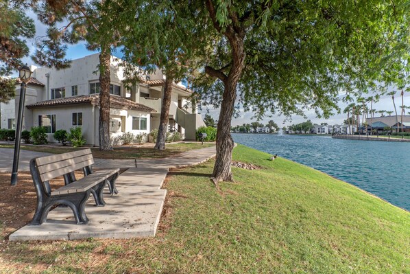 Enjoyed our 4 night stay. My husband and I enjoyed walking around the lake in the morning and enjoying our coffee on the patio. The property manager was very helpful when we were trying to figure out the key fob and ultimately negotiated a late check out as we had a late flight out. We have come to the Phoenix area several times for Spring Training and felt this location was great with easy access to the airport and highways around the city. Walking to coffee and dinner was also a plus! Would definitely consider staying here again!