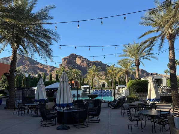 Outdoor Living: Private patio w/ dining area, mountain view