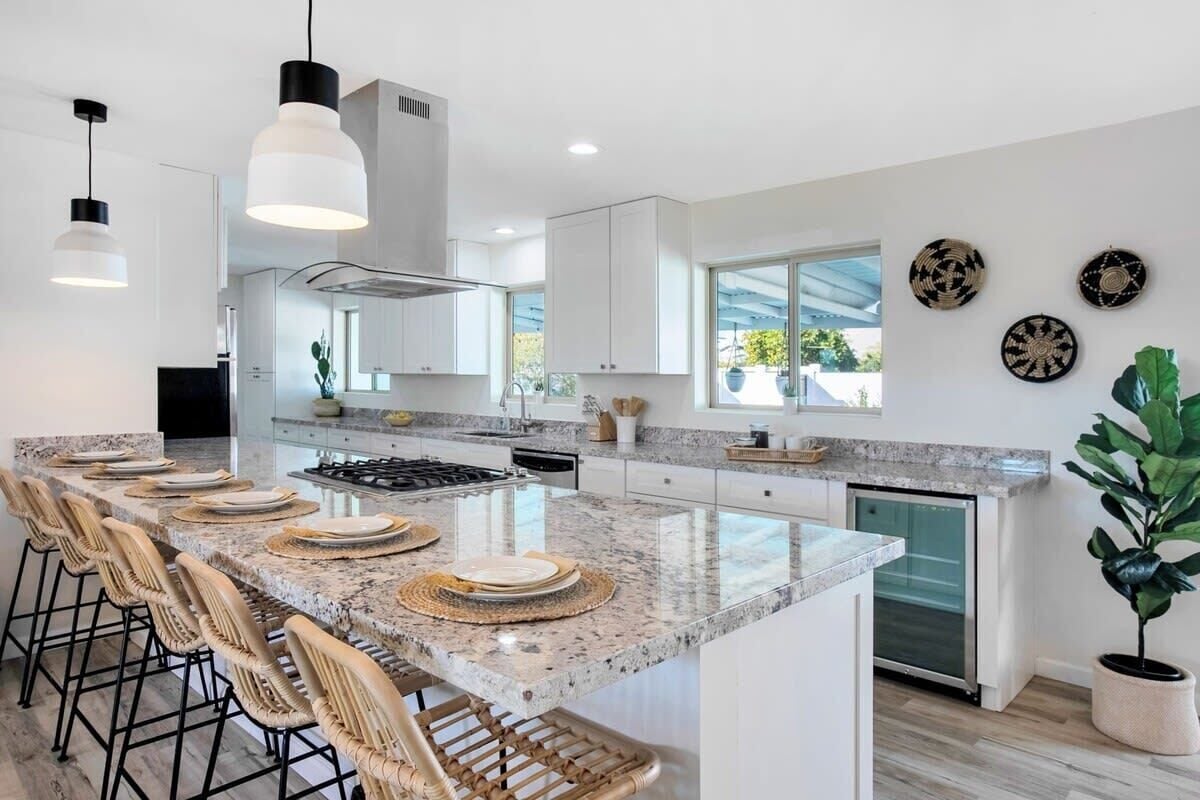 - Kitchen island and breakfast bar seating