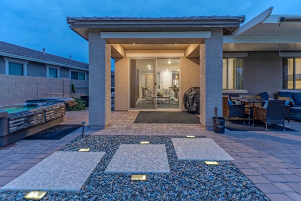 The peaceful backyard offers exciting amenities for memory making at its best. The pool heating fee is $75.00 per night to heat the pool to 80 F. for year round swimming on sunny days. An above ground hot tub invites romantic moments for two. There is a variety of seating on the covered patio to include a dining table and lounge chairs. A propane grill allows your outdoor chef to barbecue your favorite dishes to enjoy at the patio dining table. Feel warm and cozy sitting around the gas fire table on a cool evening. Longing to explore Gold Canyon and beyond? Two bikes for guests use make that possible.