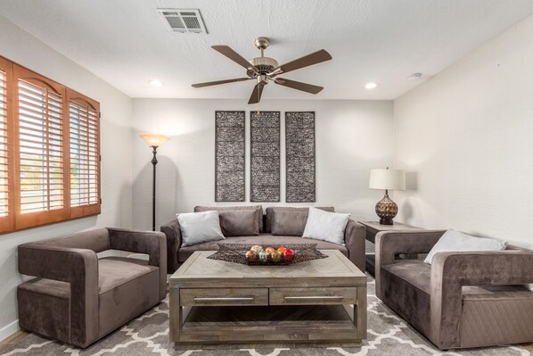 My husband and I stayed in this centrally located, well-appointed home for a month. We had both our adult children and some of our friends stay with us. Both my husband and I worked part of the time and the Wi-Fi worked well. The house is nicely remodeled and very spacious. We especially enjoyed the many different sitting areas in the backyard and being so close to a walking trail (half-block away on 10th street, follow path to canal walking path that goes for miles and miles). There are several very good restaurants close by. We really enjoyed Ladero's for Mexican food (I went 4 times!) and Timo's wine bar. Both are just down the street less than a mile. It is easy to get around from this home and only about 15 minutes from the airport. We had a great time and would recommend it.