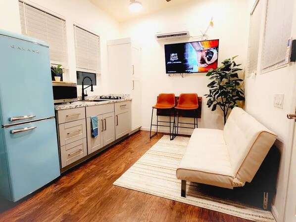 Experience the charm of a serene and peaceful tiny home/RV community nestled away from the street, yet minutes from downtown. Hosted by Cecy and her husband, this adorable tiny home boasts thoughtful design details and clever craftsmanship. With a high ceiling, step-in shower, and large TV with superb sound, it offers a well-appointed and comfortable stay.