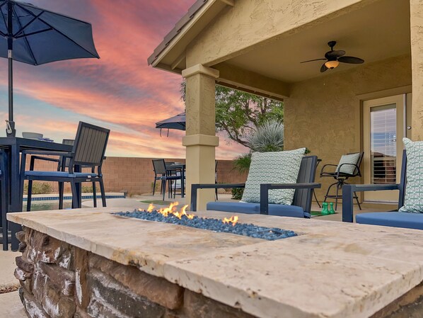 Outside in the private corner lot backyard, you'll find endless entertainment options. Take a dip in the sparkling heated pool with water feature or relax on one of the sun loungers. Gather around the fire pit for s'mores or enjoy meals at the outdoor dining tables that seat 8-10 people. There's even an expansive outdoor kitchen complete with burners and refrigerator.