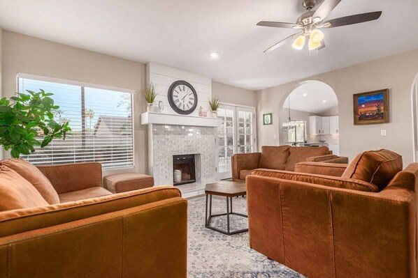 Inside, the home offers two distinct living areas, giving groups plenty of space to relax and spread out. One lounge opens directly to the backyard and pool deck, creating an easy indoor-outdoor flow, while the main living room features a large sectional and Smart TV—perfect for movie nights, game days, or unwinding after exploring the city.