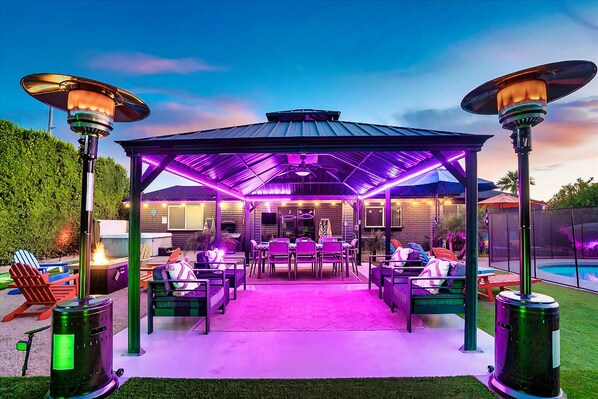 Outdoors, swim in the heated pool with safety fence, relax in the hot tub, or gather by the fire pit. Challenge friends on the pickleball court, 3-hole putting green, ping pong table, or cornhole. Cook on the propane grill, then dine under the gazebo with patio heaters for a true Rockstar experience.
