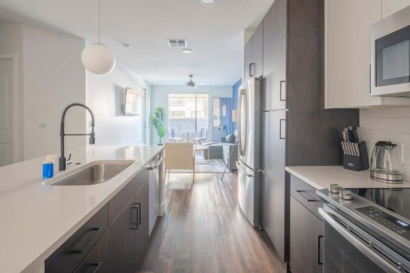 The 1BD/1BA features a fully equipped kitchen in which you can easily prepare your favorite, delicious meals. Its space and modern amenities are much more than you would expect from a 1BD/1BA apartment.