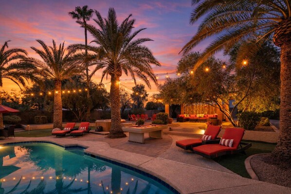 Escape to Sunset Palms, your ultimate Scottsdale escape! Dive into the sparkling pool, soak in the hot tub, or lounge on sun loungers under the desert sun. Challenge friends to pickleball, basketball, or pool. Fire up the grill for a fun feast. Cozy up around the fire pit, whip up meals in the modern kitchen, and relax in bright living space. Just minutes from Kierland Commons & Scottsdale Quarter, where you can browse boutiques, savor gourmet bites, sip cocktails & enjoy Scottsdale's energy.