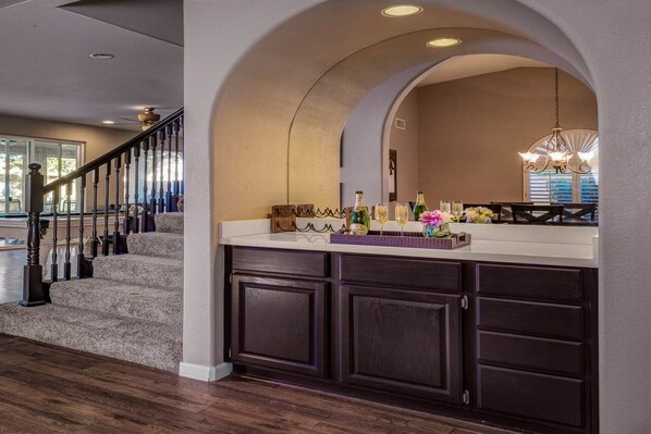 Kok måltider i det ombygde, åpne kjøkkenet eller KitchenAid BBQ ute. Spis i den formelle spisesalen, frokostkroken eller på et stort utebord på terrassen. Ikke glem morgenkaffen din fra Keurig eller den tradisjonelle kaffetrakteren.