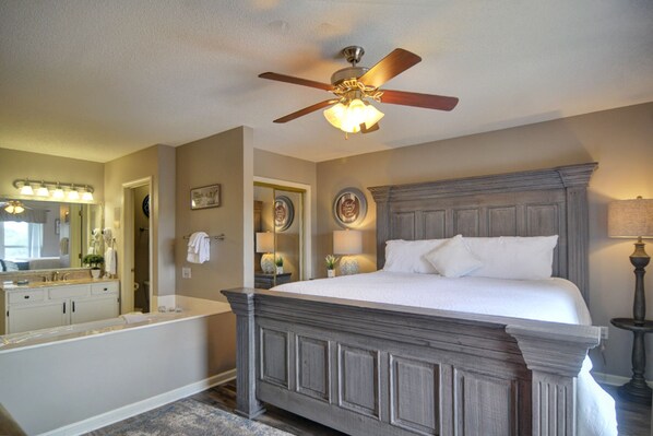 The spacious master suite has a king size bed and a flat screen cable tv. There is also an in room jacuzzi tub to soak in. The attached bathroom has a shower/tub combo.