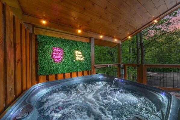 Escape to your Luxe Alpine Treehouse nestled atop a winding path through the woods. So close to Dollywood, you can hear the Dollywood train! Welcome to Dolly Top Treehouse! Enjoy the serenity of the forest while also experiencing many unique and modern amenities. This chalet is conveniently located in Pigeon Forge, 1 mile from the Parkway, 5 miles to Dolly Parton Parkway in Sevierville, 8 miles to Gatlinburg, and only 1 mile to Dollywood! Immerse yourself in a Smoky Mountain vibe while being central to all your favorite attractions. This contemporary 3 beds, 2 bedrooms, 2 baths chalet is at the top of its game with many unique features including a private outdoor sanctuary situated among a canopy of trees with multiple swings and a peaceful view of the woods and nature. You will also find a large deck with a private hot tub oasis, rooftop covered for snowy or rainy nights. Enjoy an outdoor gas Weber grill and select seating. Indoors, you will feel light and bright with large open ceilings and strategically placed windows. The open, contemporary floor plan is sure to please with beautiful contrasting colors and inviting furniture. Feel at home with a plush sectional among a cozy gas fireplace, a full-service kitchen with an eat-in bar, and fine amenities such as a Keurig, snacks, and all the kitchen utensils, plateware, and cookware you need for an enjoyable stay. Kids and kids-at-heart will be fascinated with the many unique features including, the one-of-a-kind Net Loft Reading Nook perfect for relaxing, telling stories, or reading; the custom arcade featuring over 6,000 games such as Mario Kart, PacMan, Game Shows, and so much more; and a mountain-style tent playhouse equipped with plush toys. Smoky the Bear is also always ready to meet new kids and adults alike and remains by the tent to greet you. You will be pleased to find a king-sized bed in both the main level bedroom and the treehouse bedroom located atop the spiral staircase. You will also have the option of utilizing the queen sleeper sofa located within the sectional in the living room. We love families with small children and have you covered with two available pack-n-plays. Each mattress is equipped with cloud-like toppers for a relaxing and supportive sleep. The treehouse bedroom on the upper level has one full bath included and the downstairs bath is directly beside the bedroom and also available for communal use. Guests will have access to the entire house including the decks, hot tub, and outdoor seating area. A code will be provided to conveniently access the electronic lock to the front door. Two closets inside the house will be locked for storage and for our cleaner to utilize. These will be marked as not available for use. Additionally, the crawl space door will be locked and is off limits for guest access. We are always available for your needs. The quickest and easiest way to reach us is through the platform messaging app. The neighborhood is located in the heart of Pigeon Forge, TN nestled in a woodsy area. You will travel a winding roadway to reach the top of the hill where the treehouse is located. There are several other treehouse cabins located in the resort that look similar in construction. The homes have winding paths and an overall charming vibe. This is a new construction development project and there are still some homes under construction. During business hours, you might see workers in the area doing work on the homes under construction. You will have a designated, easy access, and level parking area at the top of the hill directly in front of the unit. It will be easy getting around at the top of the neighborhood. You will have some stairs to go up to get to the front door of the cabin.