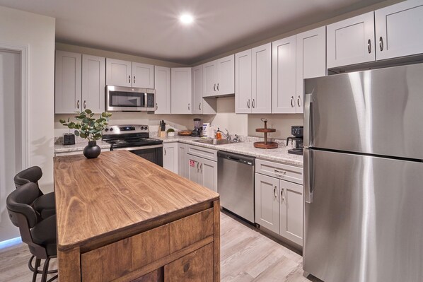 Enjoy the flexibility of preparing your own meals in the well-appointed kitchen. Well-appointed with a full-sized refrigerator, dishwasher, stove, microwave, and other kitchen appliances perfect for making breakfast, lunch, or dinner throughout your stay! All pots, pans, glasses, plates, silverware, etc., are also there for you! Gather around the inviting dining table to share stories and laughter, as it invites you to savor each bite.