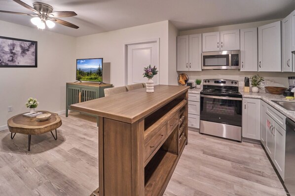 Step into a bright, inviting space where modern comfort meets cozy charm. The living area is designed for relaxation, with an open-concept layout that makes it easy to unwind after a full day of exploring the Smokies. Curl up on the sofa with your favorite book, enjoy a movie night with cable TV, or stream your favorite shows using high-speed fiber Wi-Fi. Large windows fill the room with natural light, creating a cheerful, airy atmosphere that feels like home from the moment you arrive.