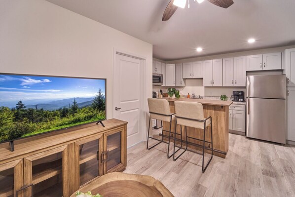 Step into a bright, inviting space where modern comfort meets cozy charm. The living area is designed for relaxation, with an open-concept layout that makes it easy to unwind after a full day of exploring the Smokies. Curl up on the sofa with your favorite book, enjoy a movie night with cable TV, or stream your favorite shows using high-speed fiber Wi-Fi. Large windows fill the room with natural light, creating a cheerful, airy atmosphere that feels like home from the moment you arrive.