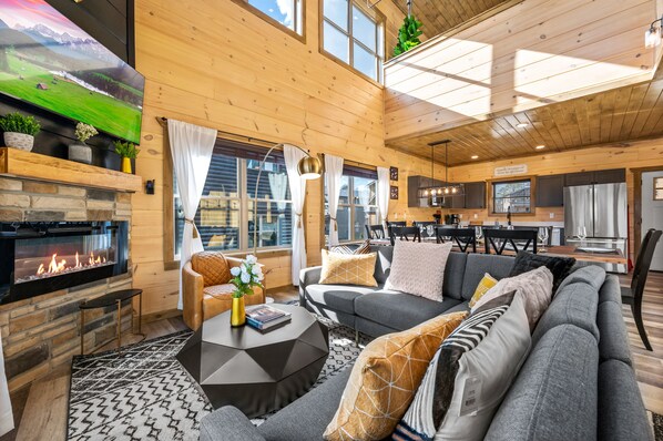 Create lasting family memories at our BRAND NEW modern cabin! This luxurious escape offers everything you need for an unforgettable getaway. After a day of adventure at Dollywood, exploring the Great Smoky Mountains National Park, or shopping at The Island in Pigeon Forge, unwind in the inviting living space, featuring a cozy fireplace that sets the perfect ambiance for family evenings. Gather around the large dining table that comfortably seats 10 for delicious meals prepared in the fully-equipped kitchen.
