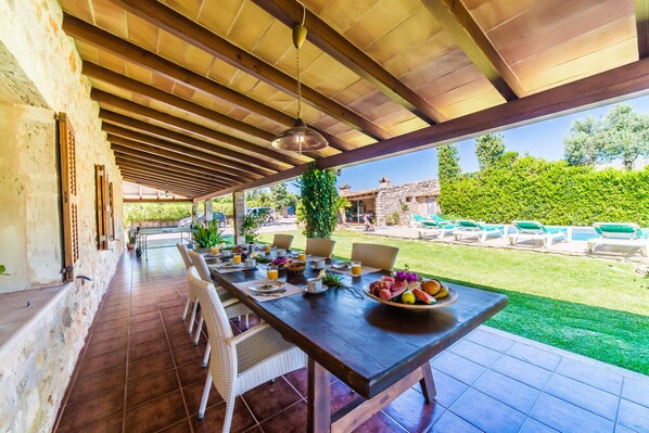 Eiendommen Moli er fanget med sine romslige utvendige områder, designet for avslapning og underholdning. Imponerende privat svømmebasseng på 11 x 6 meter, med seks komfortable solsenger og parasoll, perfekt for å nyte den baleariske solen. Du vil finne et avslappende utendørs boblebad, hvor du kan koble helt av omgitt av stillheten på den mallorquinske landsbygden. For de mer aktive har eiendommen en privat tennisbane, bordtennisbord og bordfodball, som garanterer moro for alle aldersgrupper.