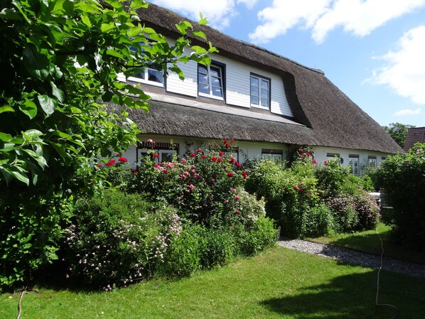 2-roms leiligheten har 55 m² og ligger i øverste etasje i den vakre halmtaket. I hagen finner du 4 hagestoler med bord og paraply, som tilhører denne leiligheten.
