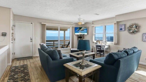 Sleep soundly in the king bed found in the oceanfront primary bedroom. This room also has a full, private bathroom, TV, and plenty of closet space. The 2nd bedroom is also oceanfront and also has a king bed and TV. The 3rd bedroom is great for single adults or teens. It has two twin beds and a TV.