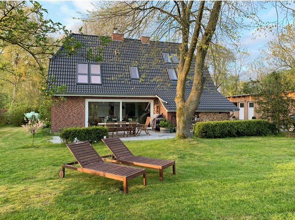 Eiendommen på 2500 m² er omgitt av en grøft, slik at ingen gjerder forstyrrer utsikten. Det er hyllebær, lønn, selje, mirabellplommer, rips, bjørnebær, en strandstol og et kurvhus for barn å leke i, en stor gassgrill, en peis, en hagesauna med peisovn og mye mer enn bare et sted i Nordsjøluften for dine aktiviteter. ,